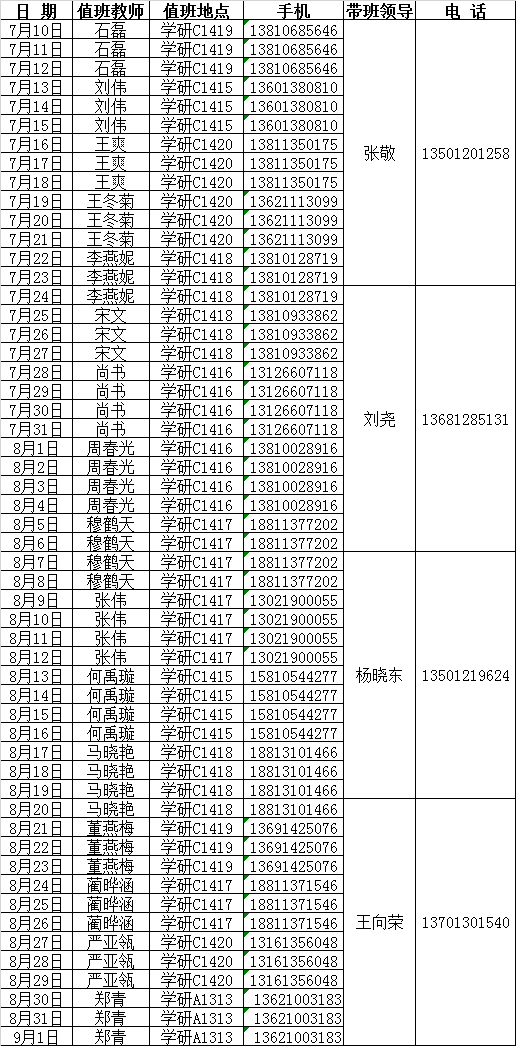 1、学院暑假期间学生值班地点在学研大厦C1417办公室,值班电话:62337845;